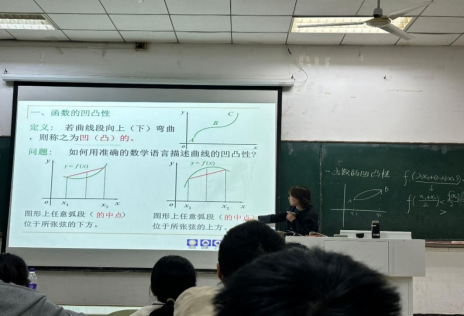 2024年11月25日上午,由胡姿岚老师在教三南103教室开展了内容为“曲线的凹凸性及拐点”的课程思政观摩课,胡姿岚老师介绍了我国杭州湾跨海大桥的辉煌历史,它不仅体现了中国人民的智慧,也体现了建设者们爱岗敬业的奉献精神和精益求精的“工匠精神”。胡姿岚老师借由杭州湾跨海大桥的外形,引发学生思考:大桥为什么没有设计成直线,而是设计成弯弯曲曲的形态?是为了减轻海潮对桥墩的冲击,减少大桥对钱塘江大潮的影响,曲线造型比直线更具有美感且有助于车辆安全驾驶。从而引入曲线凹凸性的概念及定义。同时告诫学生,在分析问题时应该全面、透彻,要透过现象发现本质。