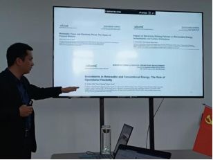 赵明教授针对复杂的国际商务环境,跨境电子商务项目在实施时会出现各种负面因素(如汇率/运费变动、海外政治限制等),从电商发展简介、在研项目、跨境电商管控数据出发,提出一种基于判别坐标分析(DCA)的跨境电子商务风险识别的框架性方法与模型及应用,从政府管理的角度对跨境商务风险进行识别和预测,与相关师生进行了深入讨论和交流。针对《安徽绿色金融发展报告》,彭维才教授在碳中和-碳达峰背景下,做了碳排放约束下资金受限的企业向银行寻求绿色融资问题报告,介绍了混合策略在两种纯策略中占主导地位,而两种纯策略之间的优势取决于市场环境,而混合策略下,绿色融资对可再生资源建设投资的影响受碳排放配额影响等问题,介绍了目前碳配额问题研究的前沿和前景。