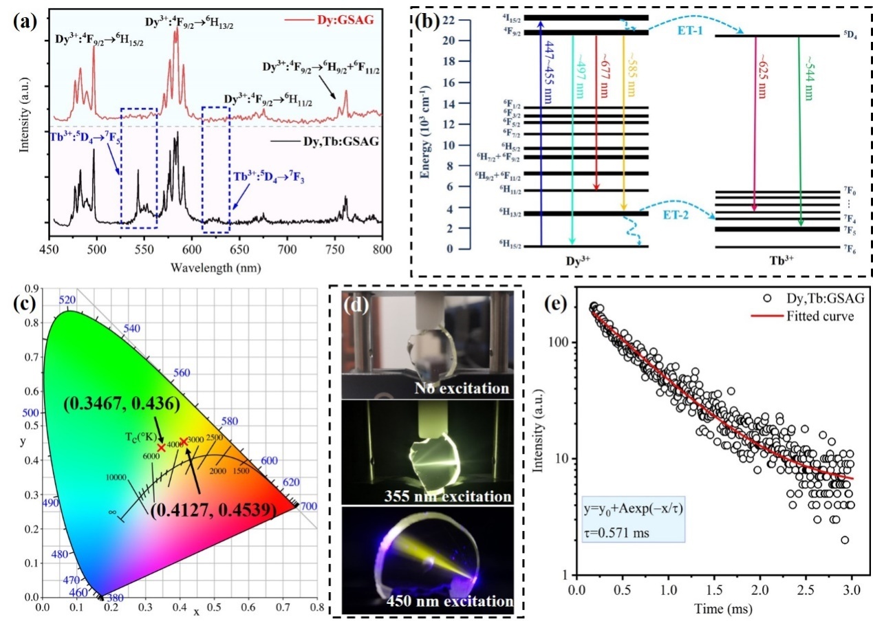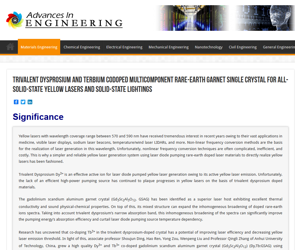 光学功能晶体与器件研究团队发表在《Journal of Materials Chemistry C》(影响因子7.393)上的研究论文(Single crystal growth and property investigation of Dy3+and Tb3+co-doped GSAG: multiple applications for GaN blue LD pumped all-solid-state yellow laser and UV or blue light chip excited solid-state lighting)被国际著名科技机构“Advances In Engineering”(简称AIE)遴选为关键科学文章(key scientific article),并以“Trivalent dysprosium and terbium codoped multicomponent rare-earth garnet single crystal for all-solid-state yellow lasers and solid-state lightings”为题在材料工程(Materials Engineering)栏目进行专题报道。团队教师丁守军为第一作者,丁守军和中科院合肥研究院张庆礼研究员为共同通讯作者。