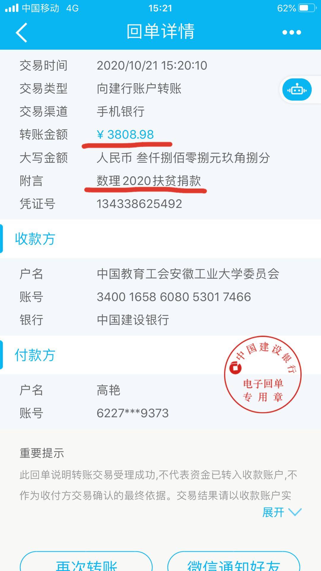 为响应校工会组织的2020年定向扶贫捐款活动,数理色动漫 老师们积极参与为贫困乡镇捐款,全院110人,其中97人参与捐款,共计捐款3808.98元,此次捐款将用于六安市裕安区西河口乡红石岩村和独山镇沙岗店村扶贫项目。现将捐款明细及上交款项公示。