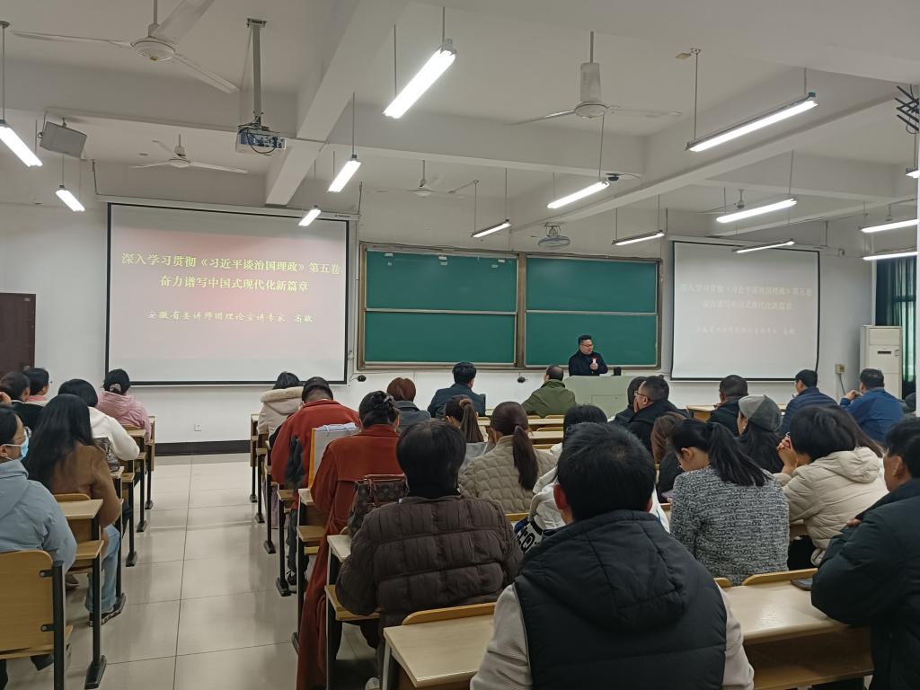 举行《习近平谈治国理政》第五卷专题辅导报告会。会议邀请安徽省委讲师团高端宣讲专家、图书馆馆长高敏教授以《深入学习贯彻〈习近平谈治国理政〉第五卷,奋力谱写中国式现代化新篇章》为题作专题辅导。报告会在数理楼403室举行,全院教职工参会,会议由学院党委书记汪春胜主持。