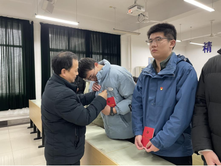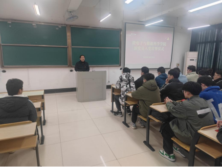 党委关于党员发展和转正的批复。面向鲜红的党旗,全体新党员和老党员起立,在微电子本科生党支部书记张佳良的领誓下,举起右手,庄严宣誓,表达对党的忠诚、为共产主义事业奋斗终生的决心。随后,汪春胜、张敏以及各支部书记一一为新党员佩戴党员徽章。光电工程系党支部、教师许瑞醒作为新党员代表发言,表达了光荣入党的激动心情和锐意进取、无私奉献的决心。微电子本科生党支部、微C211班学生张超作为老党员代表发言,表达了对新党员的祝贺、回顾了入党的初心、提出了发挥模范作用的期冀。