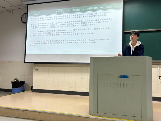 魏子豪同学曾获国家励志奖学金、校一等奖学金、全国大学生数学建模竞赛国家二等奖等多项荣誉,目前已保研至复旦大学直博。他分享了自己的成长历程与学习心得,重点介绍了在专业课学习、学科竞赛、科研创新等方面的经验,鼓励大家踊跃参加学科竞赛,积累学习经验,争取早日斩获数学建模竞赛最高奖项。在交流环节,魏子豪与2024级新生积极互动,针对同学们提出的如何规划大学生活、处理工作与学习的关系、树立目标等问题,进行了耐心细致的解答。